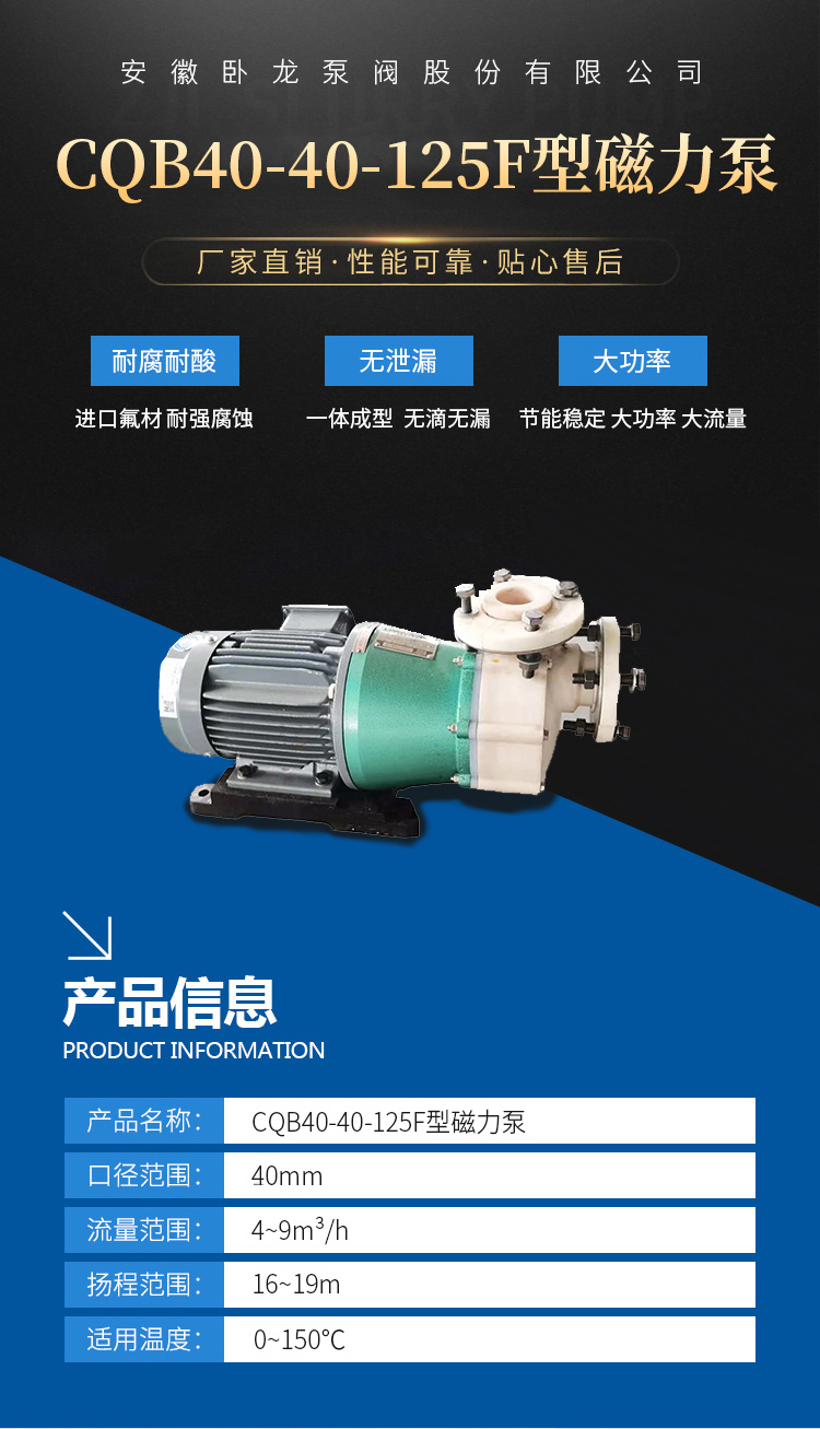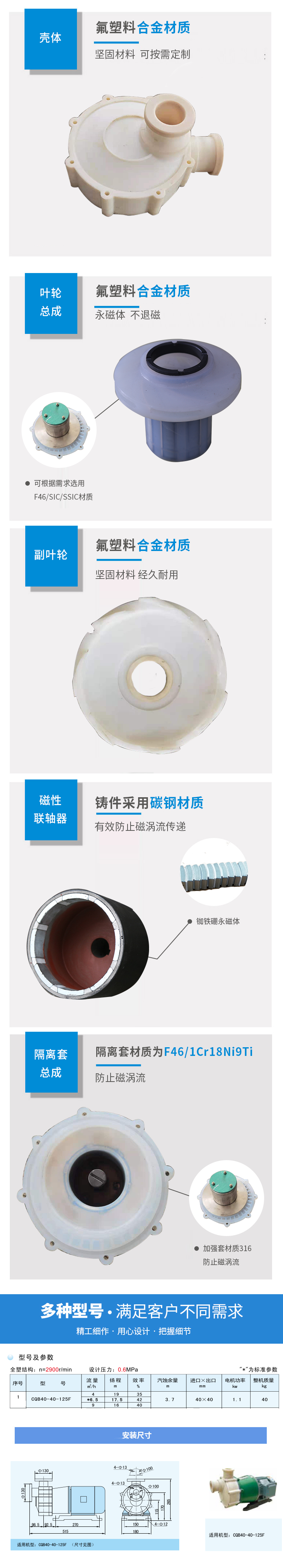 用途 本產(chǎn)品廣泛適用于:石油化工、制酸制堿有色金屬冾煉、汽車制造的酸洗工藝、稀土分離、農(nóng)藥、染料、醫(yī)藥、造紙、電鍍、無線電等行業(yè)。適用溫度:-20℃C~100℃。 設(shè)計特點 防漏設(shè)計取消了軸封,利用磁力耦合間接驅(qū)動,消除了滴漏的煩惱,不污染場地。由于泵的過流部分選用“氟塑料合金”制造。可連續(xù)輸送任意濃度的酸、堿、強(qiáng)氧化劑等腐蝕介質(zhì)而不受損。 工作原理 驅(qū)動裝置采用主動磁性聯(lián)軸器直接裝在電機(jī)軸上,泵腔完全封閉,通過磁力耦合間接驅(qū)動泵軸上帶磁鋼的葉輪旋轉(zhuǎn),結(jié)構(gòu)緊湊、安全節(jié)能。 堅固耐用的泵體 結(jié)構(gòu)雖然接觸液體部分是氟塑料,但泵體基體是金屬材料,故泵體可以承受部分管道的重量及機(jī)械性沖擊,堅固耐用。