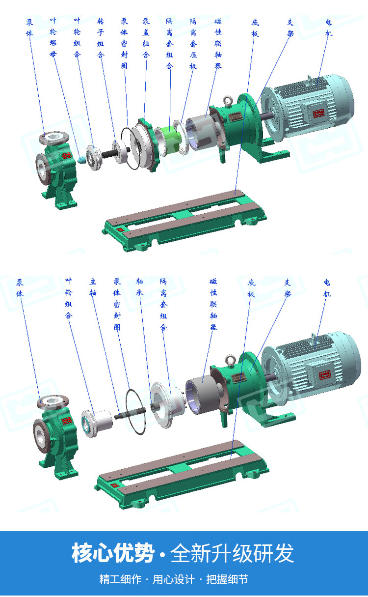 用途 IMD系列磁力泵,適用于輸送強(qiáng)腐蝕,易燃、易爆、有毒、易揮發(fā)的化學(xué)介質(zhì)。適用溫度:-20℃~100℃ 設(shè)計(jì)特點(diǎn) 1、無滴漏 IMD系列磁力驅(qū)動泵,取消了軸封,利用磁力偶合間接傳動,完全消除了滴漏的現(xiàn)象。 2、無磁渦流熱 IMD系列磁力驅(qū)動泵采用最新材料制成的隔離套具有高強(qiáng)度的力學(xué)性,徹底消除了一般磁力泵具有的磁渦流的現(xiàn)象。 3、易拆卸 IMD系列磁力驅(qū)動泵采用獨(dú)特的后拉式結(jié)構(gòu),一人便可以輕松地進(jìn)行內(nèi)部檢修和零件更換,無需拆卸管道,大大方便了日常的檢修和保養(yǎng)工作。 4、結(jié)構(gòu)緊湊 采用直聯(lián)式結(jié)構(gòu),磁性聯(lián)軸器直接安裝于電機(jī)軸上,無滾動軸承損耗,高效率、低噪音。泵整機(jī)占用場地小,節(jié)約空間,安裝簡便。
