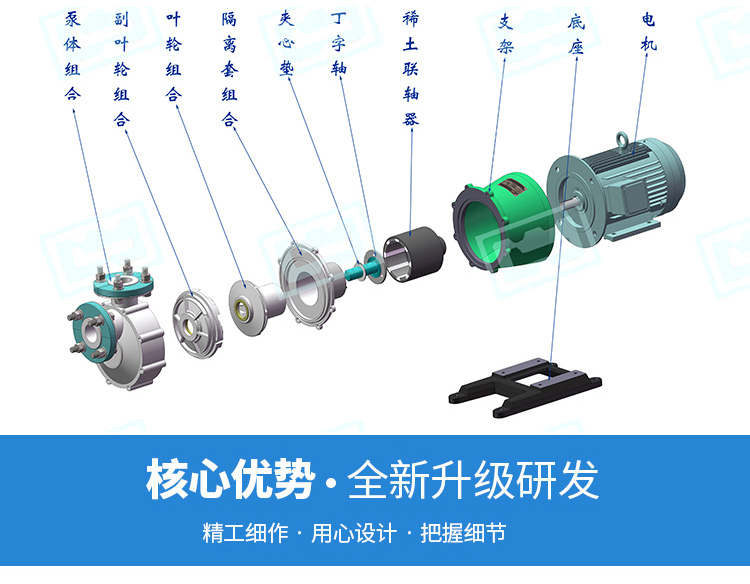 用途 本產(chǎn)品廣泛適用于:石油化工、制酸制堿有色金屬冾煉、汽車制造的酸洗工藝、稀土分離、農(nóng)藥、染料、醫(yī)藥、造紙、電鍍、無線電等行業(yè)。適用溫度:-20℃C~100℃。 設(shè)計特點 防漏設(shè)計取消了軸封,利用磁力耦合間接驅(qū)動,消除了滴漏的煩惱,不污染場地。由于泵的過流部分選用“氟塑料合金”制造。可連續(xù)輸送任意濃度的酸、堿、強(qiáng)氧化劑等腐蝕介質(zhì)而不受損。 工作原理 驅(qū)動裝置采用主動磁性聯(lián)軸器直接裝在電機(jī)軸上,泵腔完全封閉,通過磁力耦合間接驅(qū)動泵軸上帶磁鋼的葉輪旋轉(zhuǎn),結(jié)構(gòu)緊湊、安全節(jié)能。 堅固耐用的泵體 結(jié)構(gòu)雖然接觸液體部分是氟塑料,但泵體基體是金屬材料,故泵體可以承受部分管道的重量及機(jī)械性沖擊,堅固耐用。